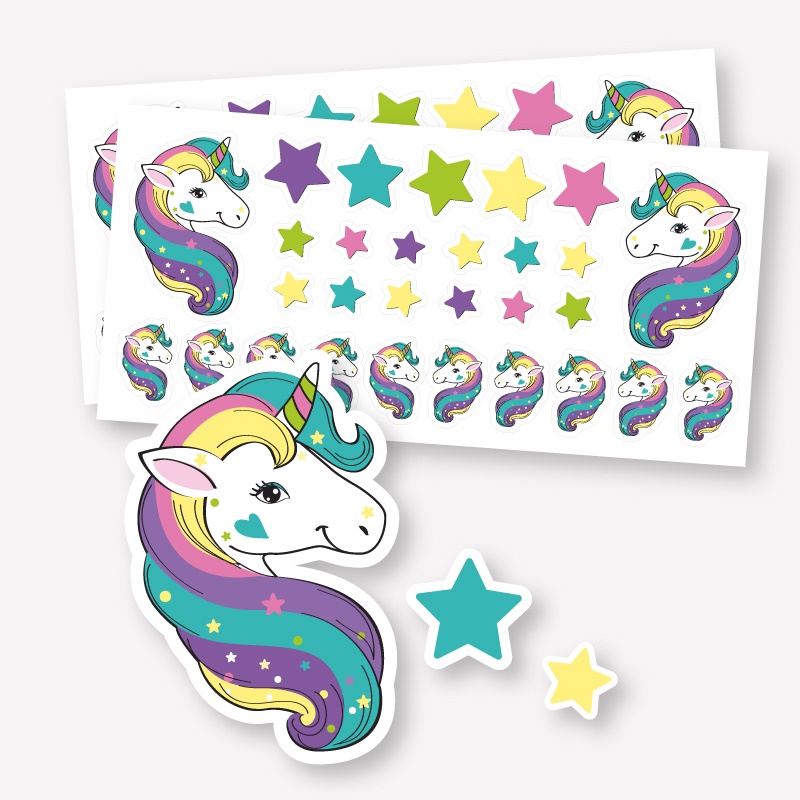 Unser 56-teiliges Stickerset mit Einhörnern eignet sich hervorragend zum Verschenken, Dekorieren oder zur Motivation in der Schule. Ein jedes Set besteht aus Einhorn- und Sternenaufkleben in verschiedenen Farben und Größen.