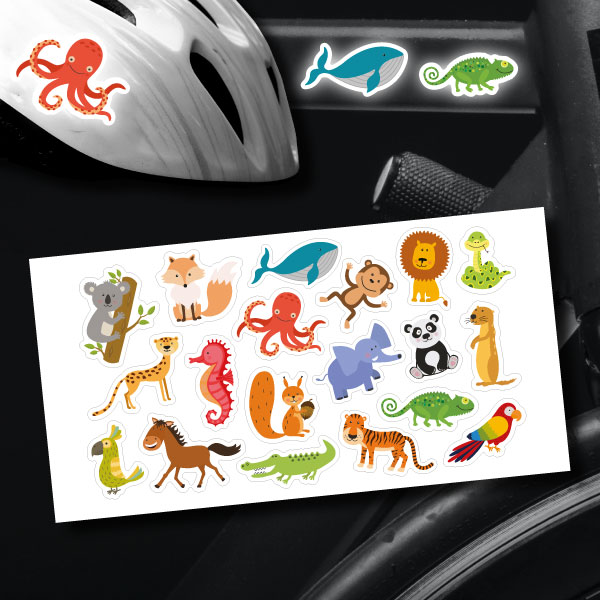 Unsere reflektierenden Fahrradaufkleber als Tiere Set, mit Motiven wie Koala, Pferd, Fuchs, Affe, Elefant, u.v.m. sind eine stylische und sichere Methode nachts im Straßenverkehr auf sich aufmerksam zu machen. Unsere Reflektoraufkleber, welche eine hohe Reflektionskraft mitbringen, sorgen dafür, dass man von anderen Verkehrsteilnehmern besser gesehen wird. Die Folien können auf nahezu jeder glatten, sauberen Oberfläche, wie dem Fahrrad, Roller, Inlineskates oder dem Helm angebracht werden und sind wasser- und kratzfest. Zudem verwenden wir nur zertifizierte, reflektierende Folie, die für den Straßenverkehr zugelassen sind.